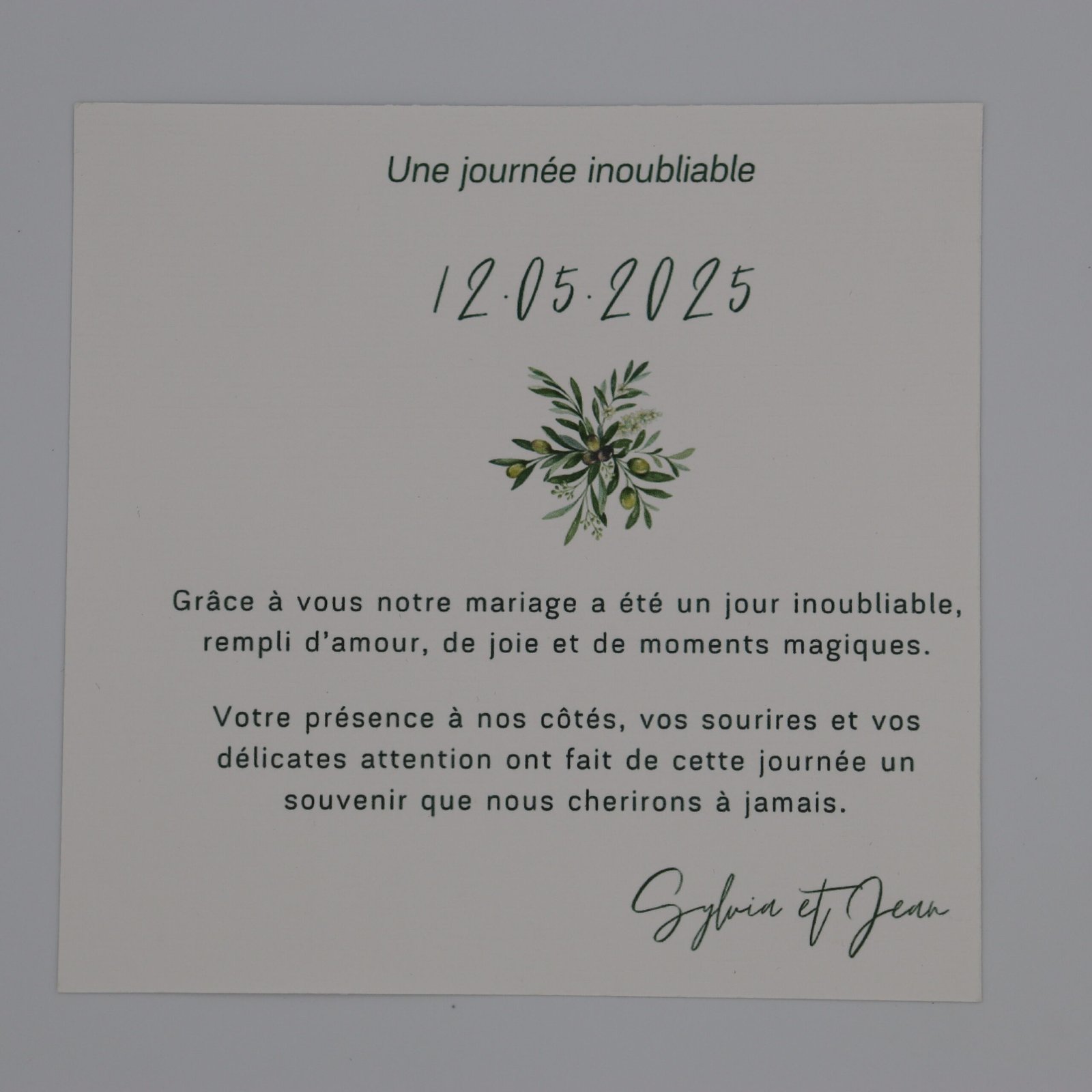 Remerciez vos invités avec douceur grâce à la carte de remerciement Éclat d’Oliviers.
