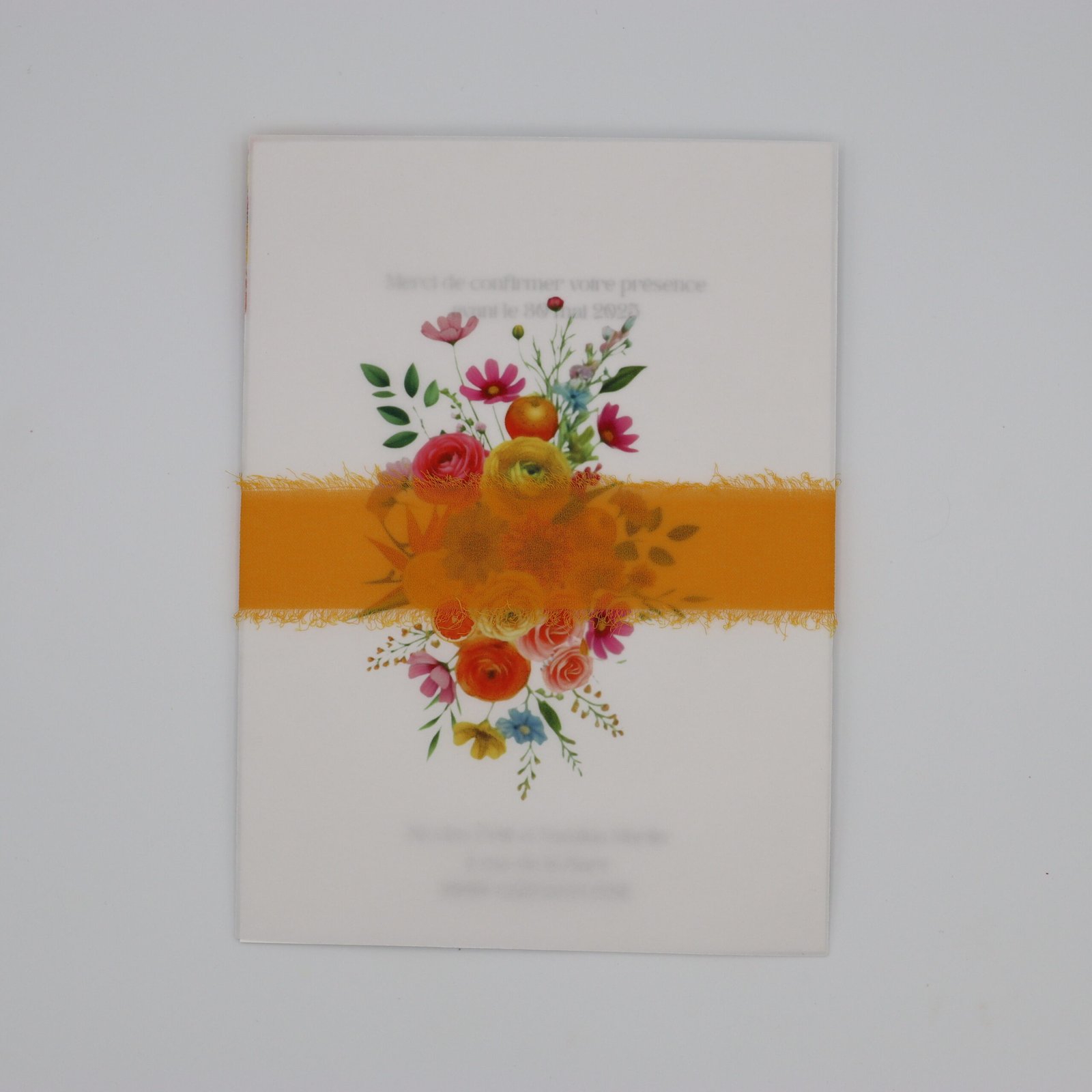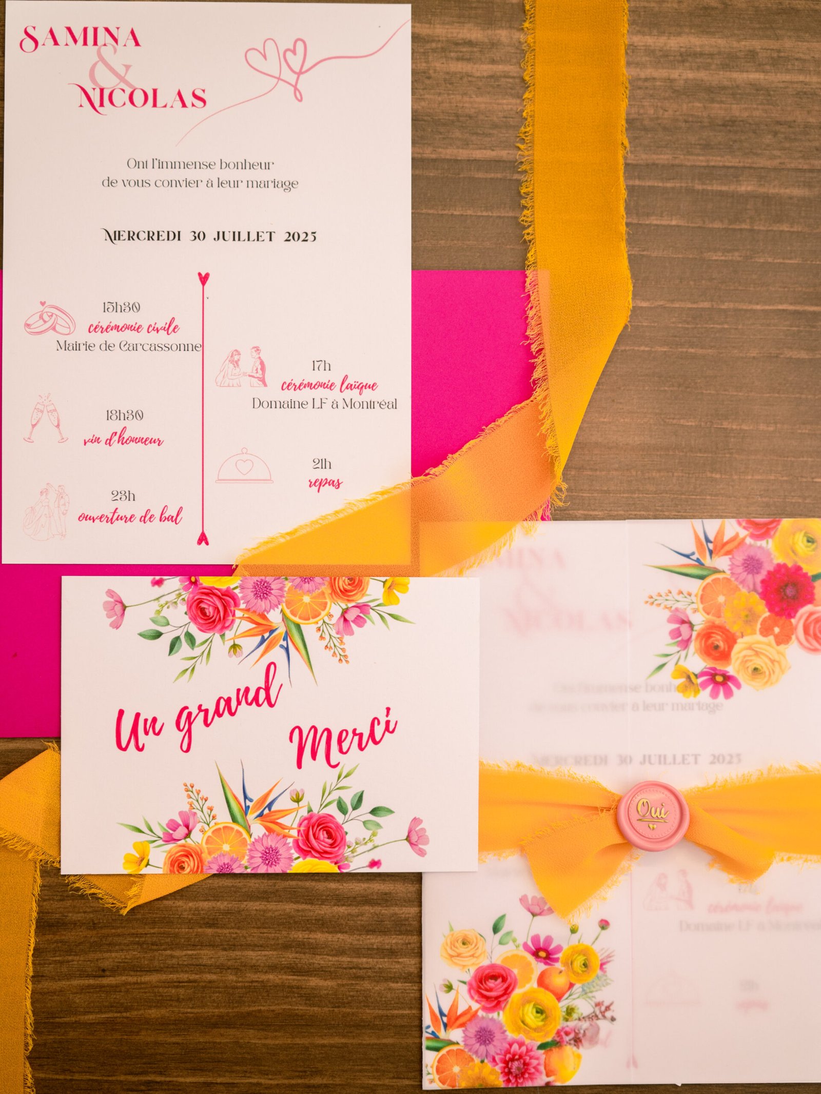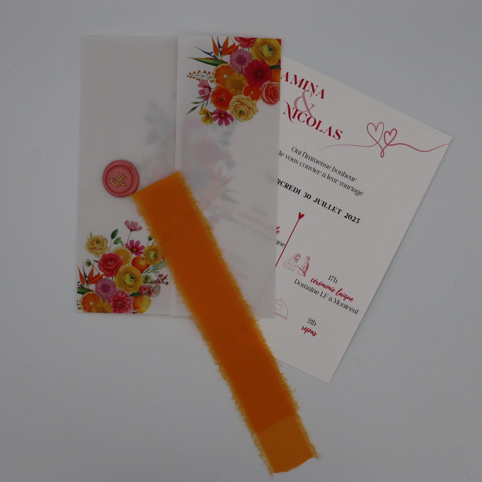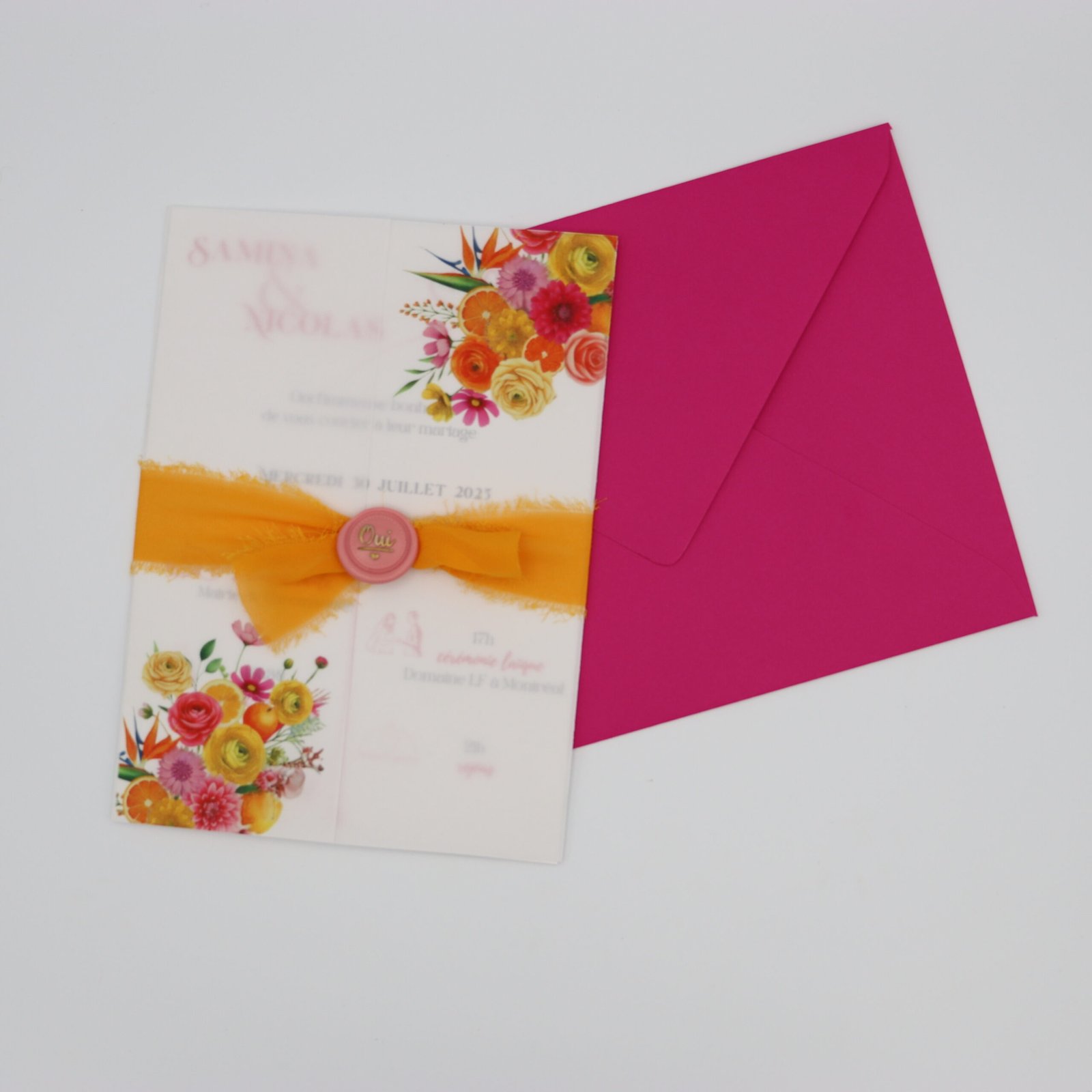 Un faire-part éclatant avec couverture calque imprimée, ruban orange et sceau rose, invitation intérieure en vélin 300 g et coupon réponse assorti. Parfait pour un mariage estival et coloré.