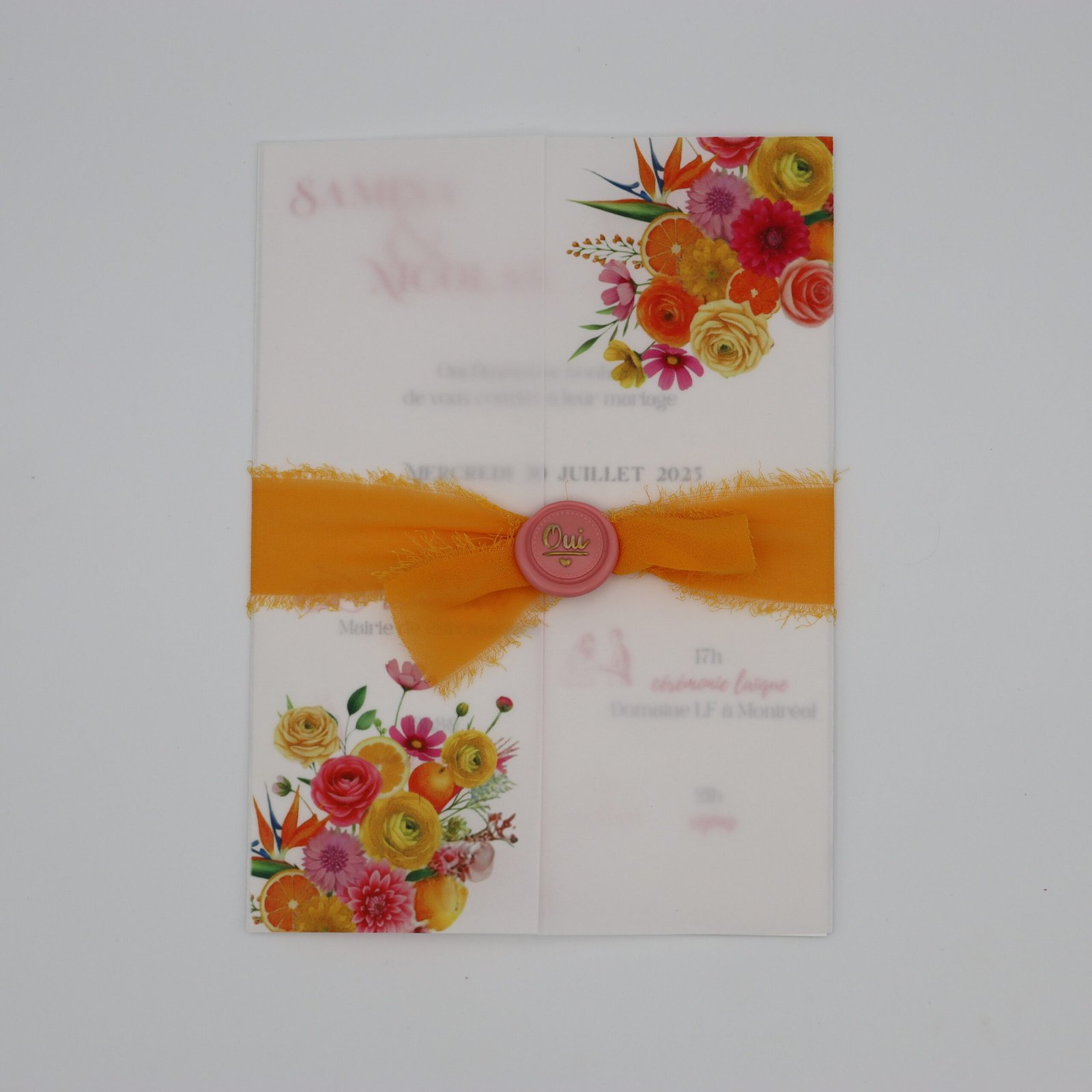 Ce faire-part Summer love associe élégance estivale et dynamisme grâce à sa couverture en calque imprimée d’agrumes et de fleurs vibrantes, nouée d’un ruban en mousseline de soie orange et scellée d’un cachet rose “oui”.