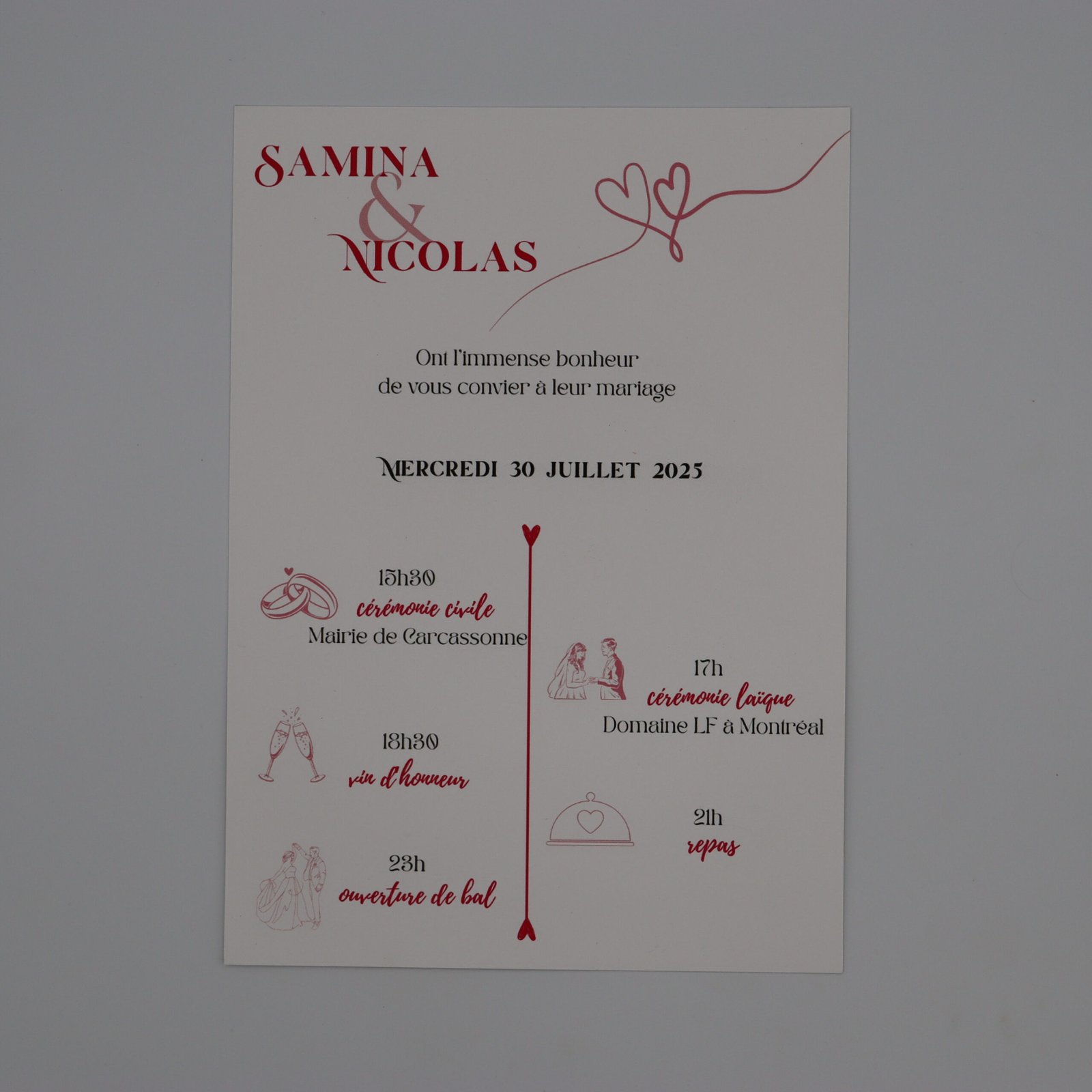 - Texte entièrement personnalisable : prénoms, date, lieu, message d’invitation…