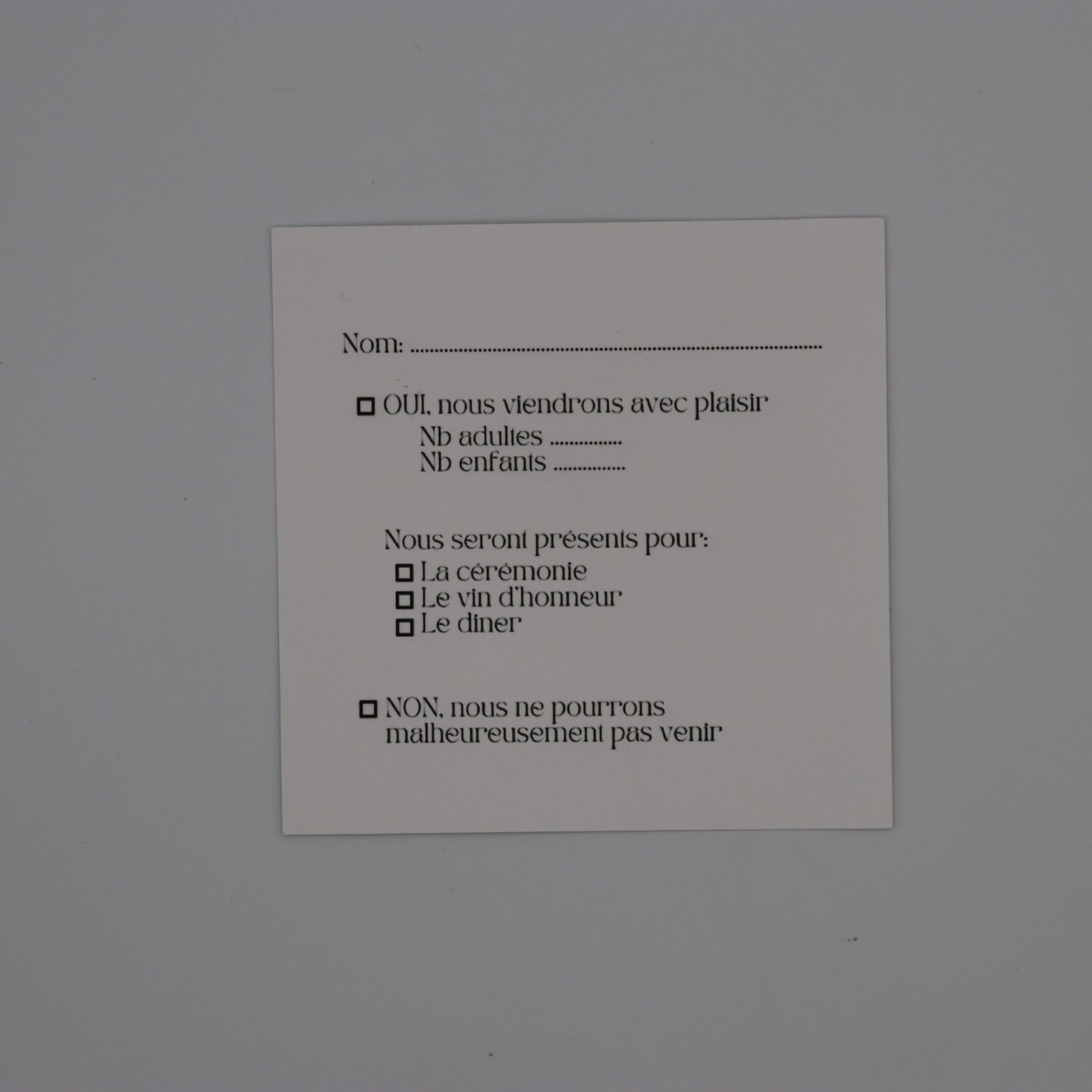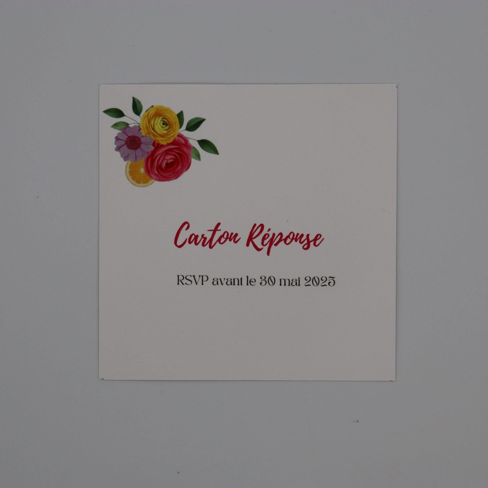 À l’intérieur, le papier vélin blanc 300 g révèle une invitation lumineuse, complétée d’un coupon réponse assorti.