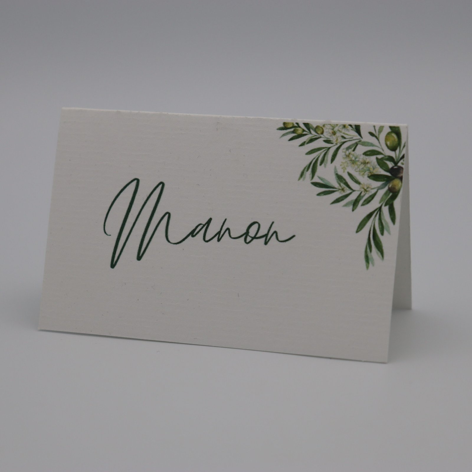 Un marque-place raffiné au design olivier, parfait pour sublimer vos tables. Papier vergé 210 g et personnalisation des prénoms.