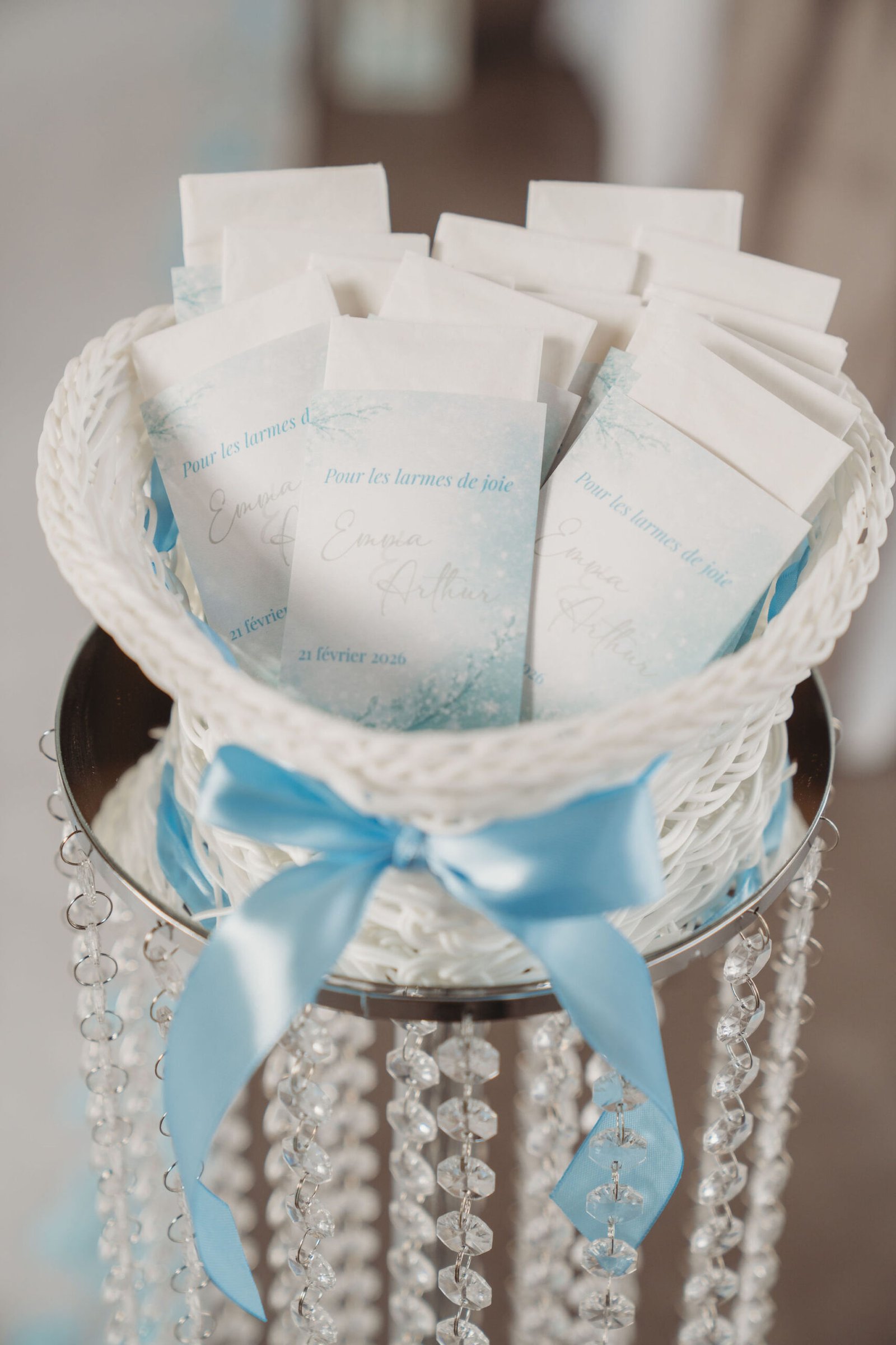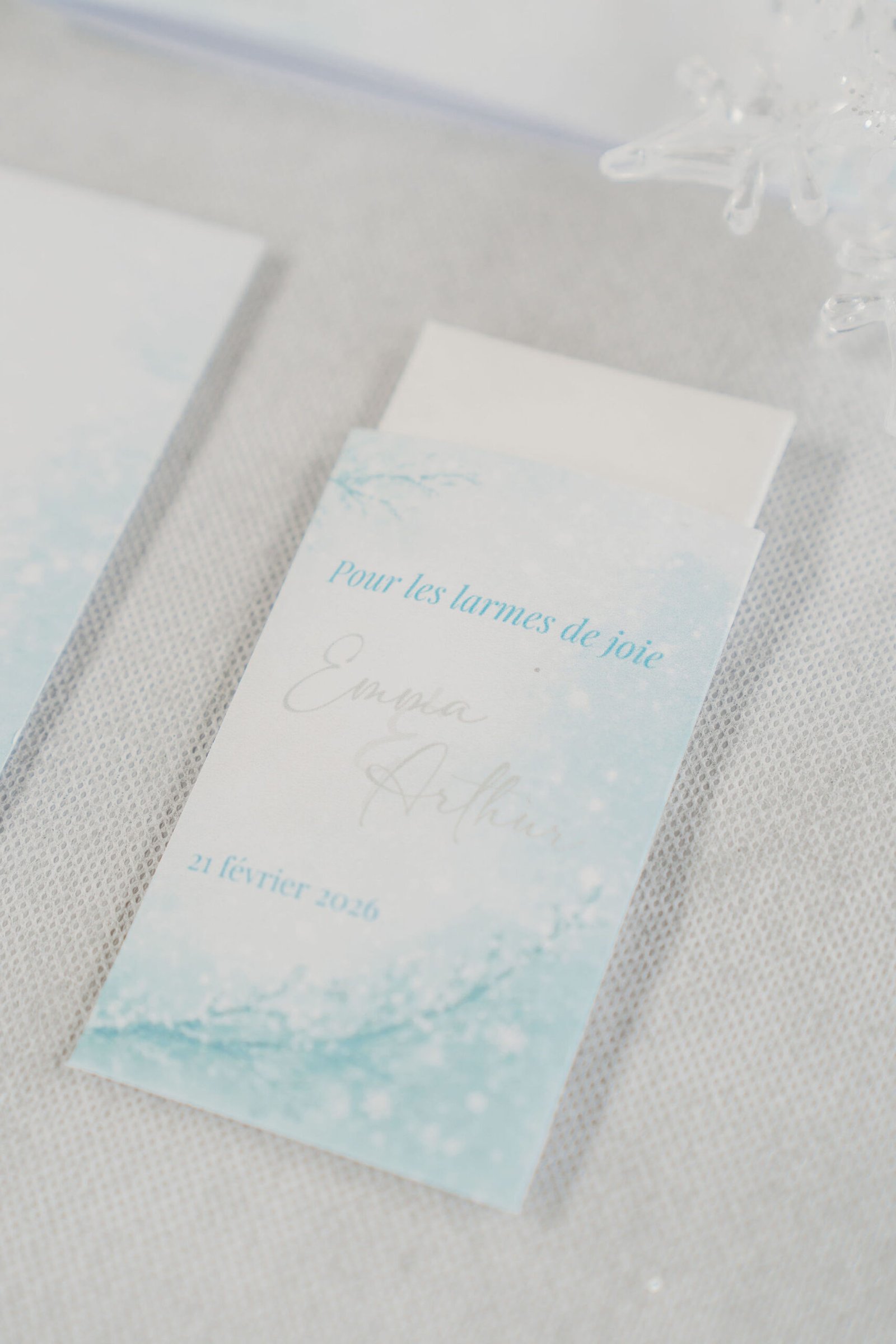 Offrez à vos invités une attention pleine de douceur avec ces pochettes larmes de joie de la collection Givre d’amour.