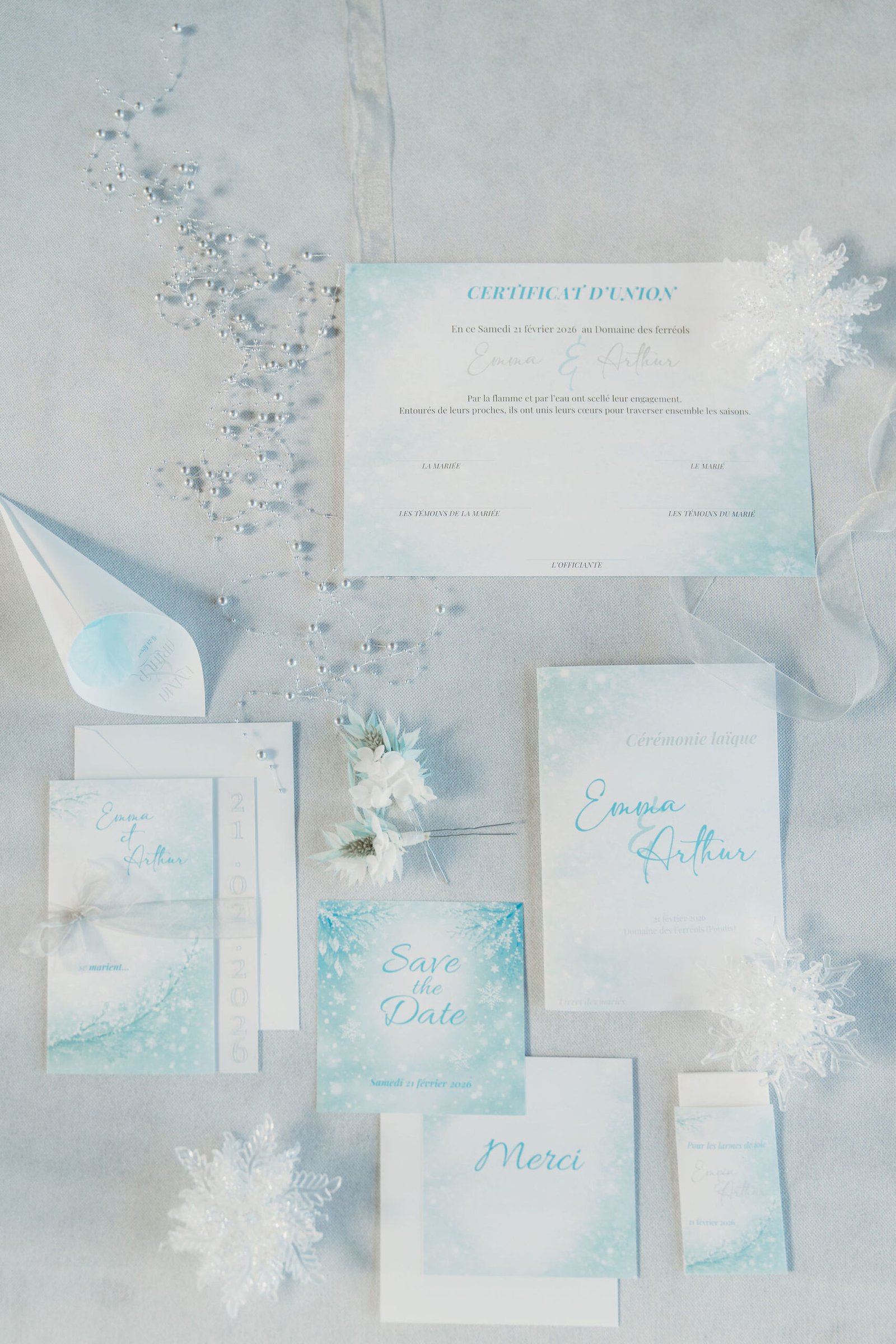 Cette pochette Larmes de joie s’accorde à merveille avec toute la collection Givre d’Amour : menus, noms de table, livrets, affiches et certificats symboliques.