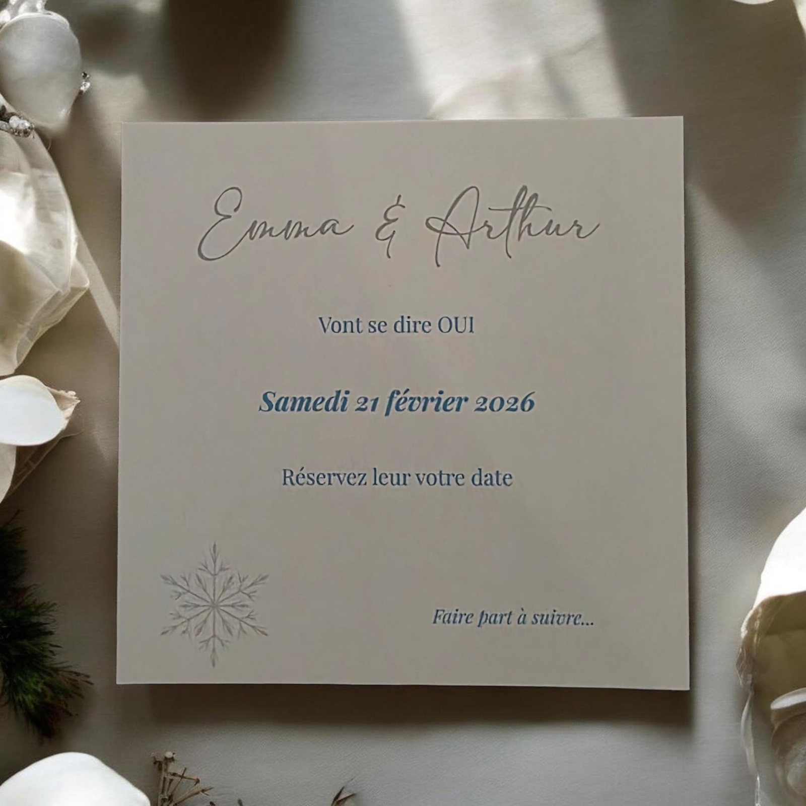 Un Save the Date élégant aux inspirations hivernales, imprimé sur papier lisse, pour annoncer votre mariage avec douceur et raffinement.