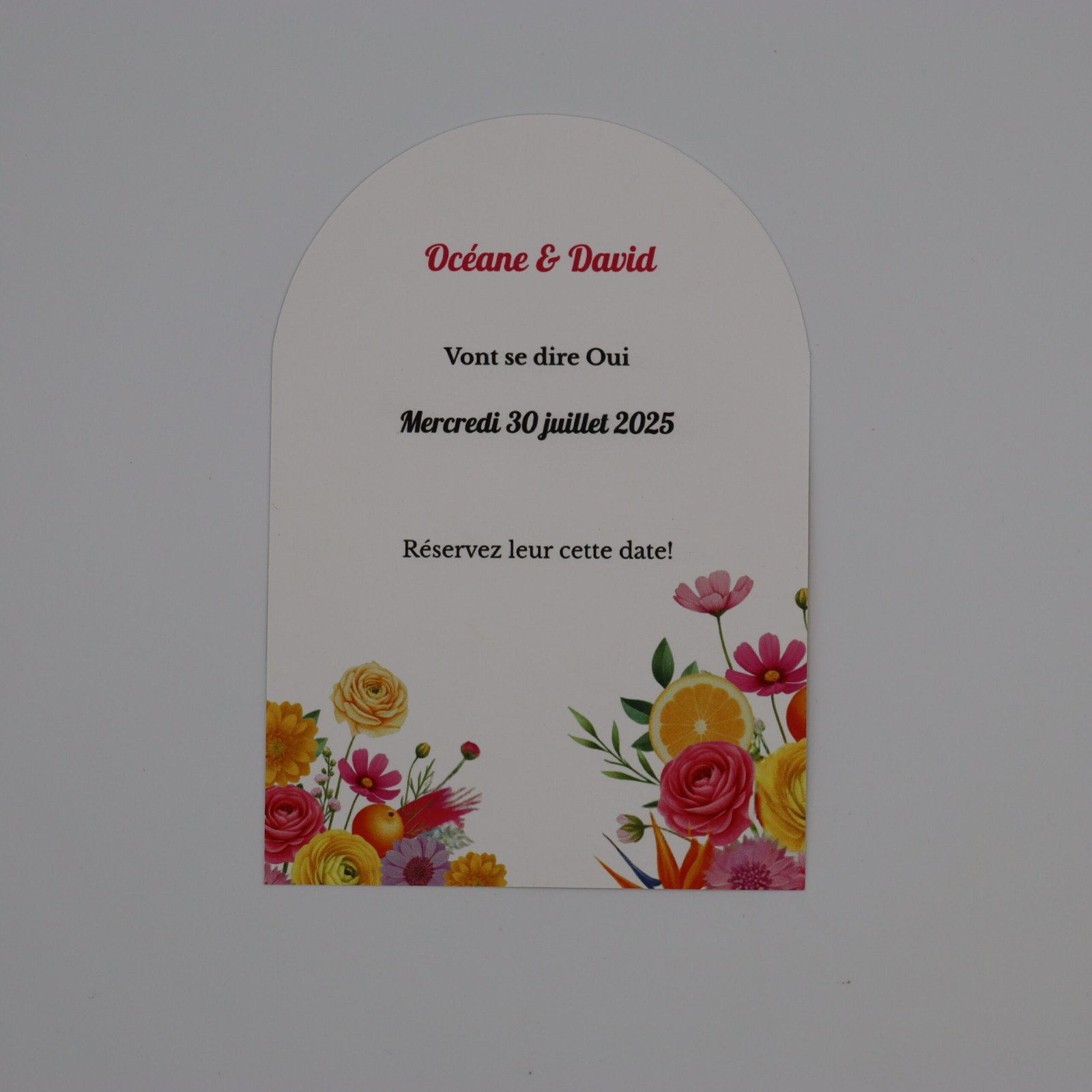 Un Save the Date lumineux et coloré, imprimé sur papier vélin 300 g avec découpe en arc, parfait pour annoncer un mariage estival chaleureux et plein d’énergie.