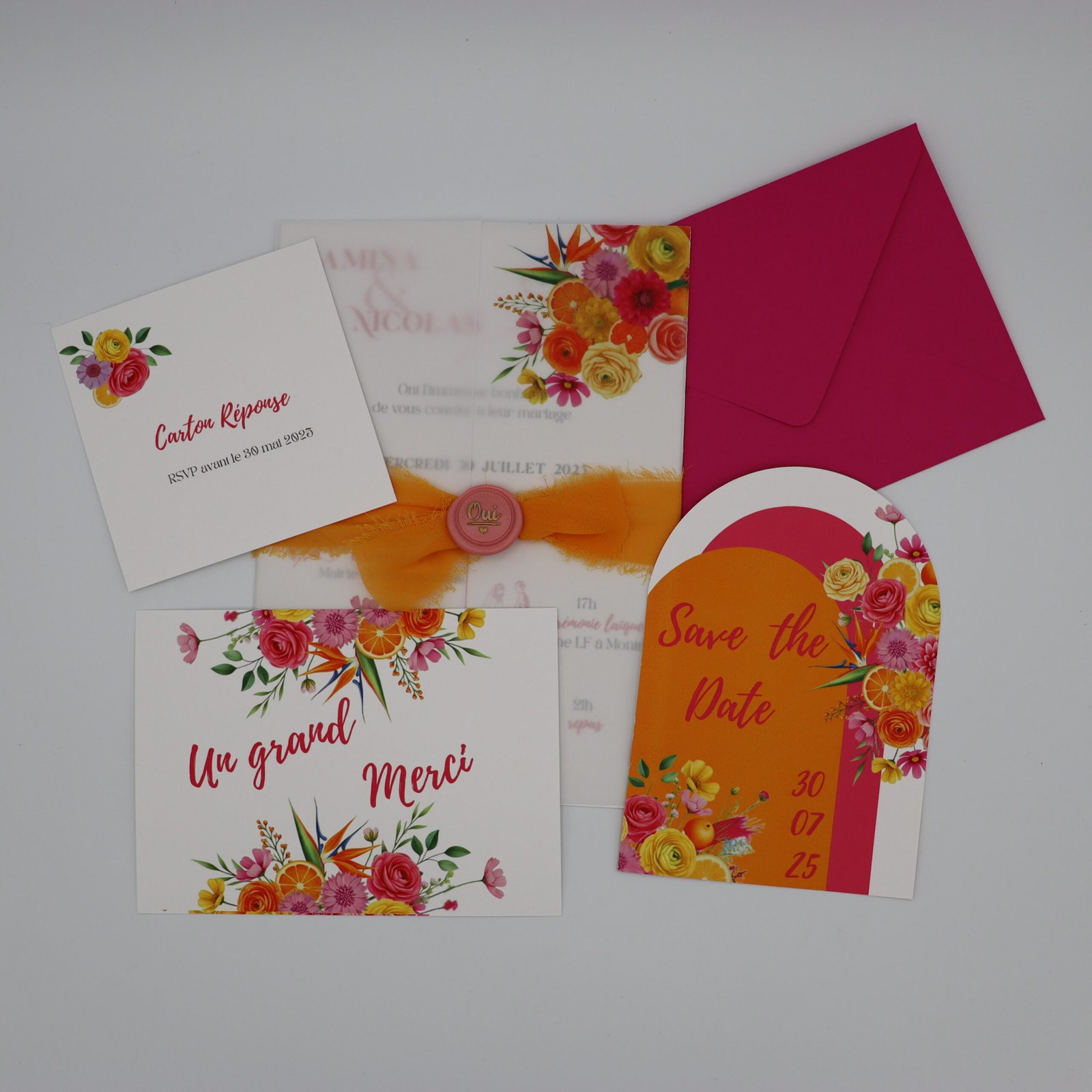 Avec ses illustrations florales et d’agrumes dans des tons jaune, fuchsia et orangé, il annonce une célébration joyeuse, chaleureuse et vibrante.